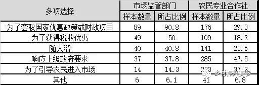 在开展农民专业合作社案例调研时,也验证了这一点,例如陕西宝鸡市的某农民专业合作社理事长反映:“听周边农户和部分村干部讲农地今后只向农民专业合作社流转,自己虽然无法判断传言的真伪,但是看到周围人先后注册成了农民专业合作社,自己也就注册了”。又如课题组在吉林某市市场监管部门农民专业合作社库随机抽取、并现场调查的某农民专业合作社,是一个典型的空壳社。该合作社理事长的妻子介绍说:“看见村里有人注册了农民专业合作社,怕自家以后错失优惠政策,于是随大流,借了几户亲戚的身份证,夫妻二人也就匆匆注册了一家,但是注册后,从未开展过经营活动”。陪同课题组调研的当地基层工商所负责人表示,这种情况在该乡镇的几个村庄较为普遍,从一个侧面反映了投机创立农民专业合作社,在一些地区已经成为一个较为突出的严峻问题。